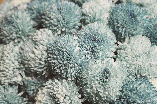 フルブルームマムの工程から、花専用の染料を水揚げさせることで様々なカラーのフルブルームマムが誕生します。弊社副代表はカラーコーディネートの資格を有しており、お客様のオーダーに合わせた色の染マムを提供することが可能です(2週間以上前に要予約)。